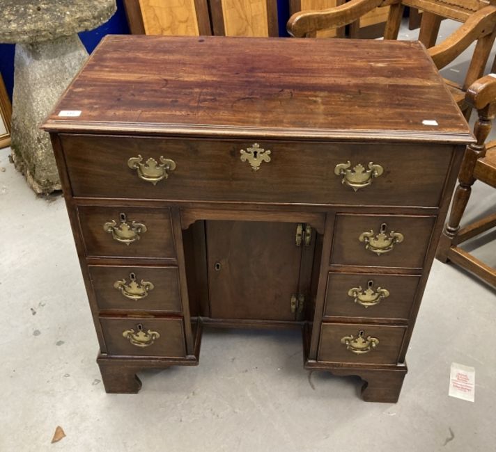 18th cent. Mahogany knee hole desk the top with moulded edge above a long drawer with a secret drawer below flanked by three small drawers with oak linings. The central cupboard door opens to reveal a shelf on bracket feet. The brass handles replaced. 31ins. x 18½ins. x 32ins.
