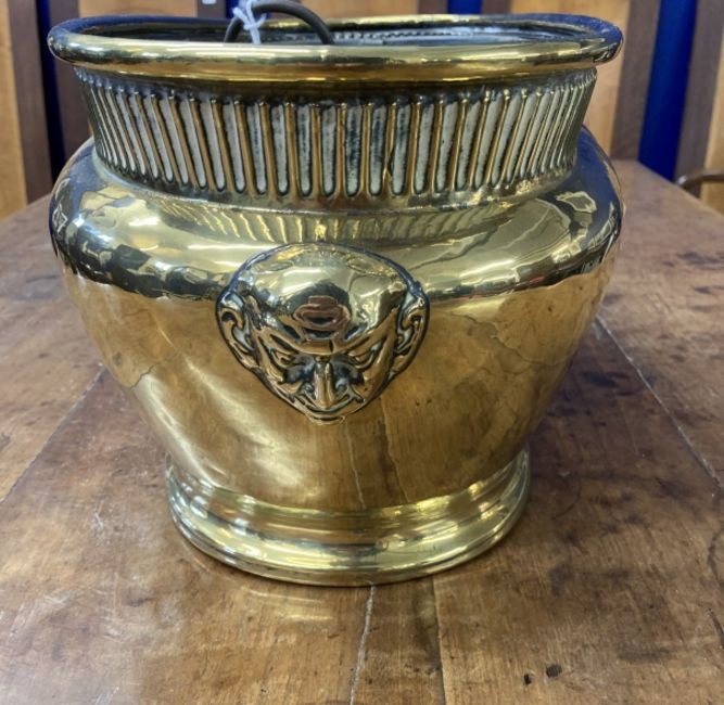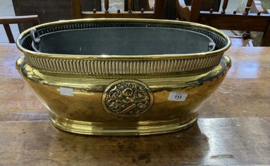Metalware: 19th cent. Brass oval jardiniere the top with a fluted above a central roundel with an embossed knight's helmet above a shield, on a moulded base, the handles formed as heads of Oriental men, zinc inner. 19ins. x 10ins.