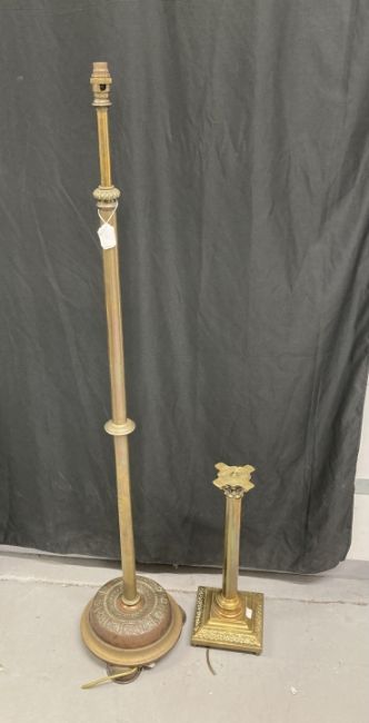Metalware: Early 20th cent. brass adjustable standard lamp, round column on an embossed round base with bun feet 62ins. fully extended & a reproduction brass Corinthian column lamp.