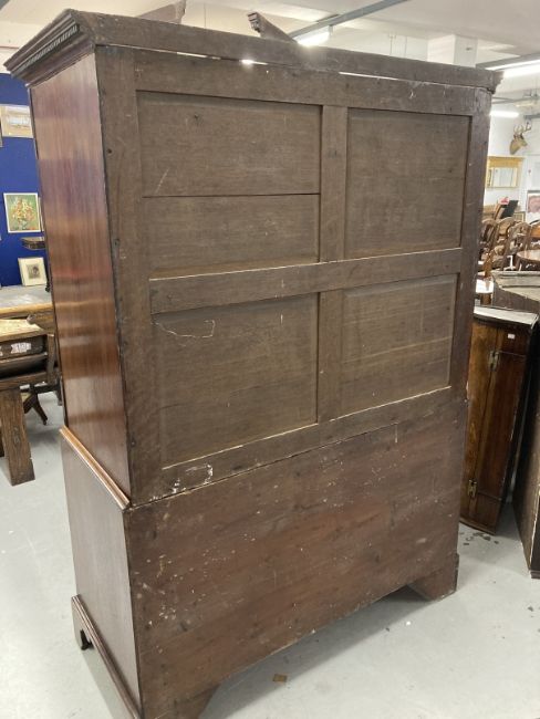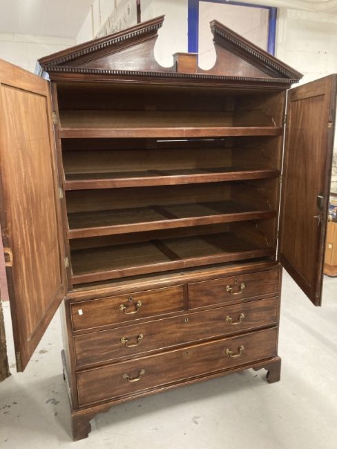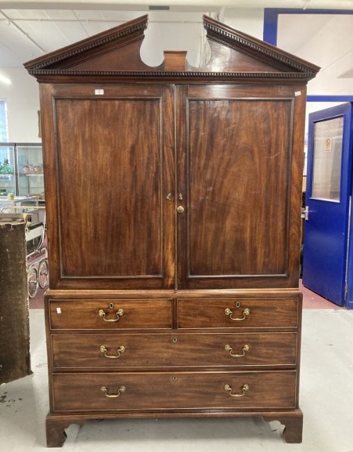 19th cent. Mahogany press cabinet on chest four slider press on two over two chest of drawers on bracket supports all surmounted by a broken pediment top.