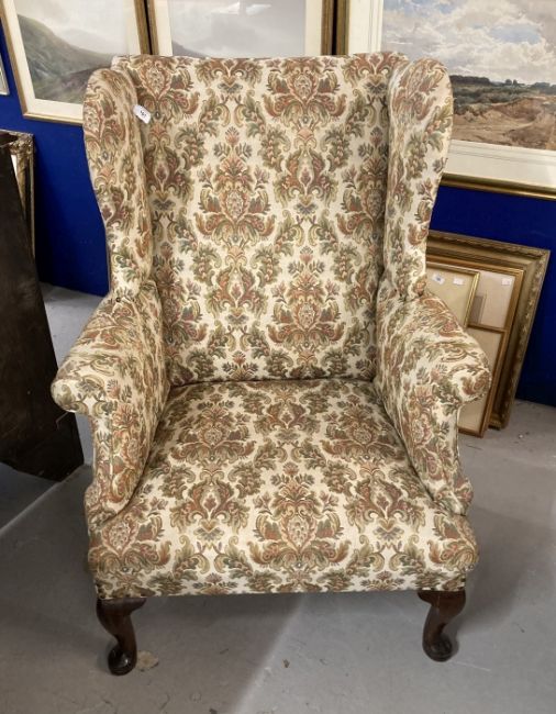 19th cent. Paisley upholstered high wing back chair, front pad feet sloping rear supports. Height 43ins. Width 32ins.