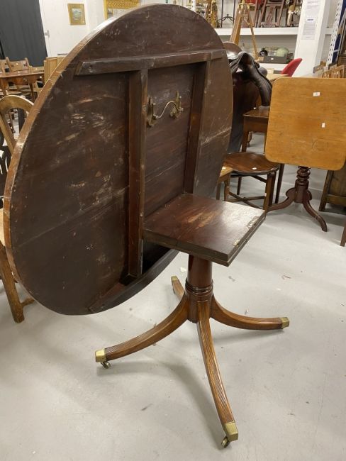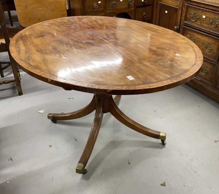 Regency mahogany oval breakfast table on single column and four splayed supports. 52ins.