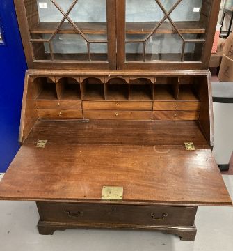 Georgian mahogany bureau bookcase with astragal glass, some panes cracked (5), and fitted interior. 39ins. x 82ins. x 23ins.