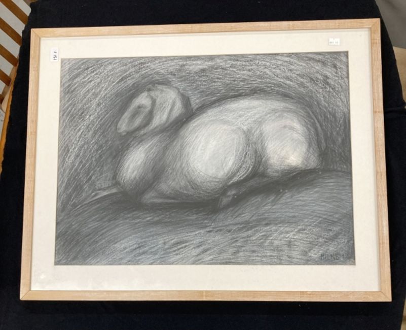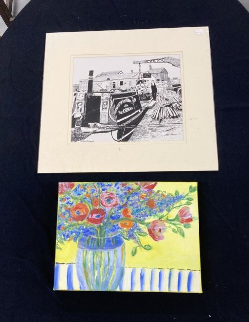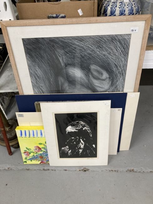 Group of large original 6 art works in ink and 2 watercolour landscapes by one hand, all in mounts. Including a working waterways scene, a city bridge, a brewery dray, animals and landscapes. Together with a large charcoal ram after Milne, framed and glazed. 20¾ins. x 29ins. Modern box canvas still life floral image. 11¾ins. x 16¼ins. Renoir La Louge print to canvas A/F. (11)