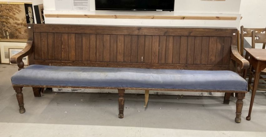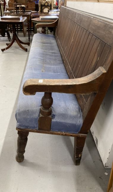 Late 19th cent. Pine bench tongue and groove back, scroll arms, upholstered seat on three turned legs to the front and two square legs, one repaired, to the back. 104ins. x 22ins.