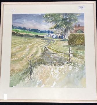 Sydney Greenwood (1913-2001). RWA, RI, FRSA: Goldsmith's College. Later studies in etching and lithography at Atelier Mourlot in Paris and Hayter's. 20th cent. Watercolour painting of farmland, with a cottage and a line of washing blowing in the breeze. 18¼ins. x 18ins, glazed frame 17¾ins. x 22½ins. Unsigned, biographical label verso. Greenwood was elected a member of the RWS in 1969, Fellow of the Royal Society of Art 1980, and a member of the Royal Institute of Painters in Watercolours.
