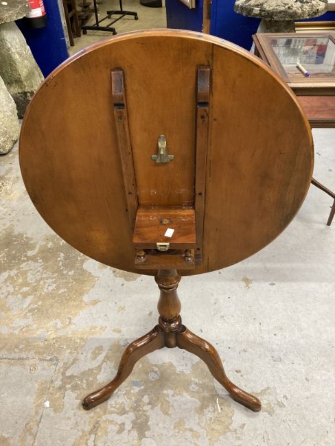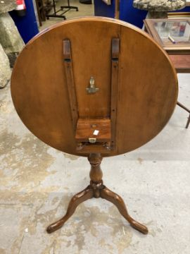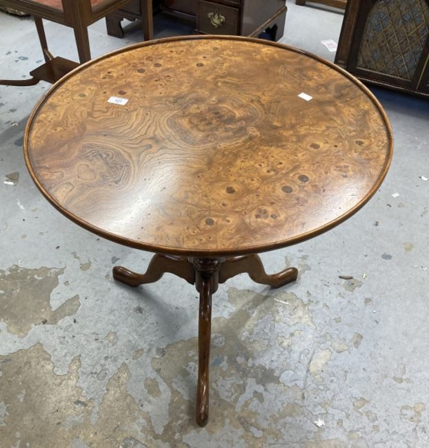 20th cent. Tripod table, burr elm dished top on a bird cage support turned column and three cabriole legs. 27ins. x 20½ins.