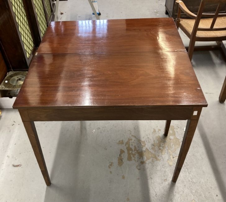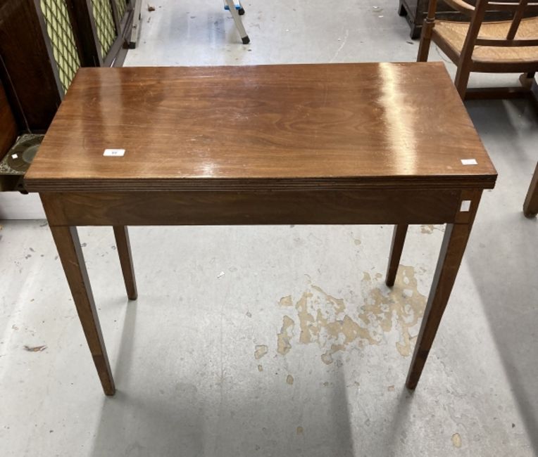 19th cent. Mahogany tea table, the rectangular top with reeded edge on squared tapered legs. 34ins. x 17¼ins closed x 28¾ins.