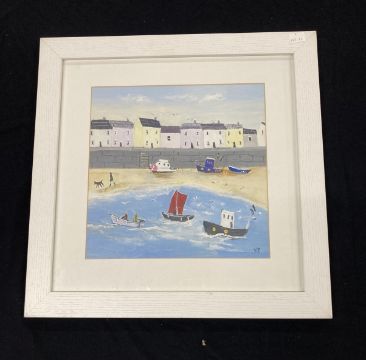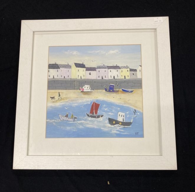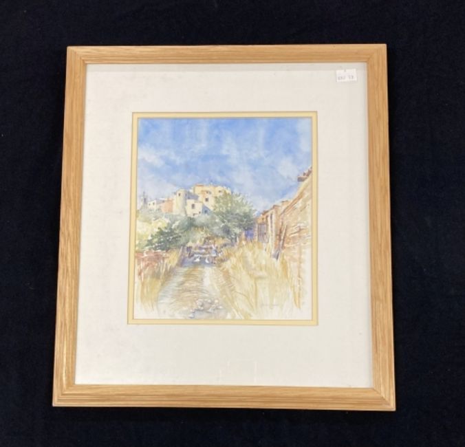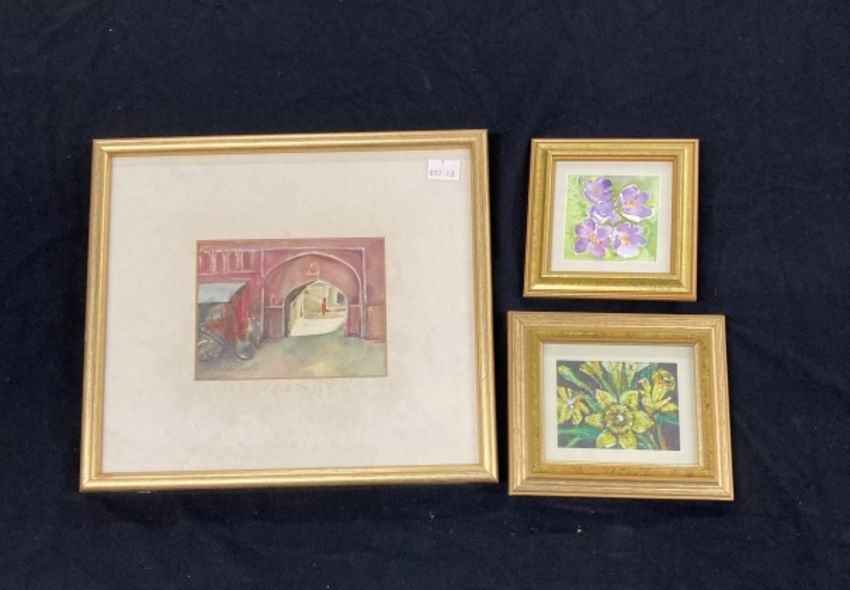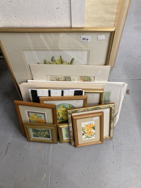 Paintings & Prints: 20th century four small watercolours in frames, lilies, daffodils (x 2), crocus and a silk work, framed and glazed. 1987 etching signed Hance/Hands, numbered 242 of 350, framed and glazed. Modern acrylic on board of Busy Lizzies and two acrylics on board of female figures in cafes. 9¾ins. x 11¾ins. Araceli Booth (British, 20th-21st cent.). Watercolour, "The Pink City", signed, framed and glazed. 4ins. x 6ins. Contemporary Harbour print in white wood frame, initialled HP, titled Harbour II, framed and glazed. 11¼ins. x 11¼ins. Five 1949 mounted colour plates from "Both Sides of the Road, A Book About Farming" by Sidney Rogerson, illustrated by Charles Tunnicliffe OBE, RA (British, 1901-1979). Aspects of farming. Mounts are each 16ins. x 12ins. 1970 reprint folder of Henry Alken plates of British Sports (originally 1821). There are four plates missing: 4, 5, 6, 7. The rest (12) are there and in good clean order. Each plate approx. 7¾ins. x 11½ins. 19th century coloured plate from Mr Carlyon's Christmas (Randolph Caldecott 1846-1886). Hunting print in a mount. 9¼ins. x 11ins. 20th century floral and bird oil on board signed CHG Lapelle, 16ins. x 12ins, together with a Paris Place du Theatre print. 20th century watercolour by Sandra McCabe (1943-2020) "Tuscany Landscape". Signed lower right, framed and glazed. 10½ins. x 9ins. Araceli Booth (British, 20th-21st cent.) Watercolour of lilies, signed lower right, framed and glazed. 14ins. x 10½ins. (21)