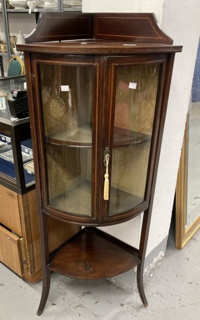 Edwardian bow front corner display cabinet. The top with a gallery, the 2 doors with checkered inlay a under shelf on splayed legs 22½ins. wide 15½ins. deep and 51½ins. high.