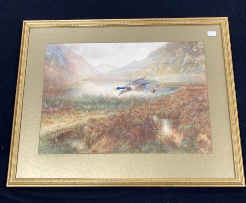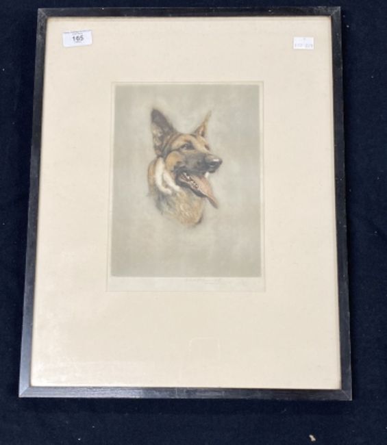 George Rankin (1864-1937): Watercolour , mallards in flight signed lower left, framed and glazed. 14ins. x 19¾ins. Print of a German Shepherd dog, stamped Rembrandt Guild artist proof, signed, framed and glazed. 10ins. x 7½ins.. Watercolour of woodpeckers, unsigned. (3)