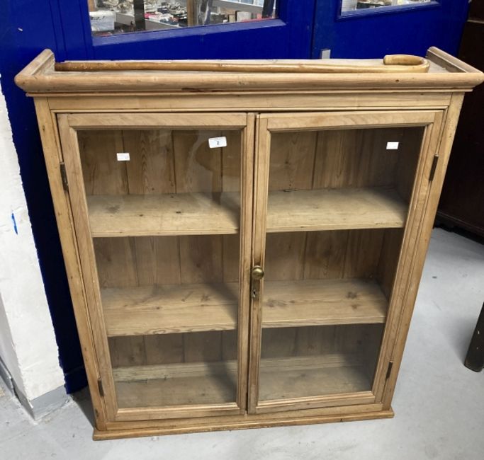 Late 19th cent. pine glazed door cupboard moulded cornice above 2 glazed doors & 2 fitted shelves. 36ins. x 11ins. x 42¼ins.