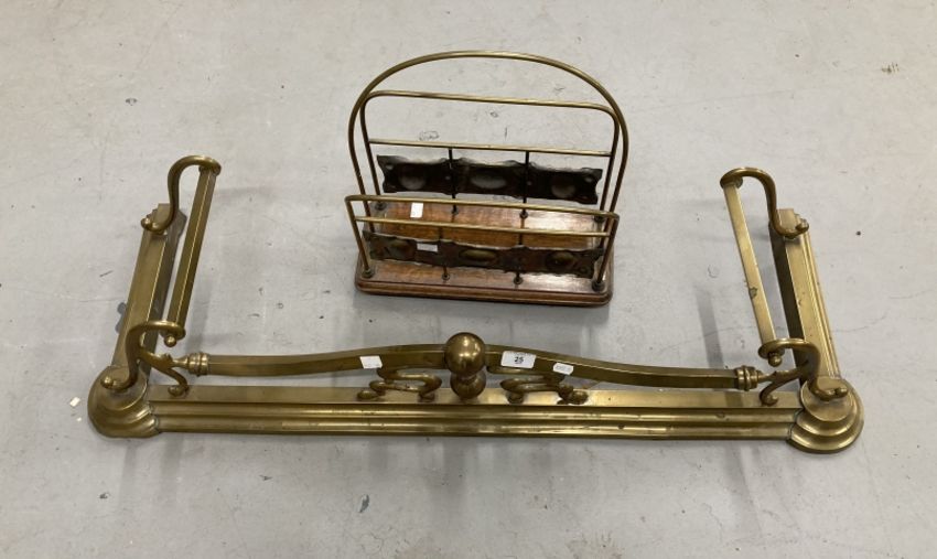 Art nouveau brass fender and an early 20th cent. brass & oak magazine rack.