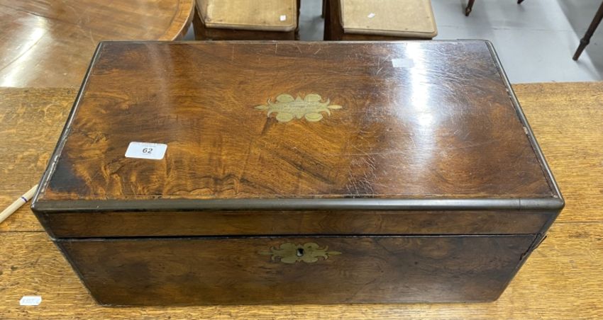 19th cent. Rosewood brass bound writing slope the top with presentation plaque dated 1867, inset brass handles to the side, opening to reveal slope and three secret drawers. With faults. 19¾ins. x 10½ins. x 8¼ins.