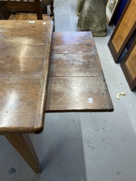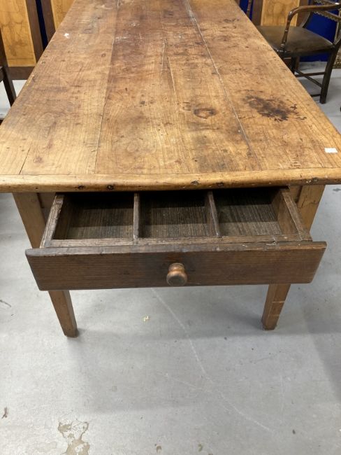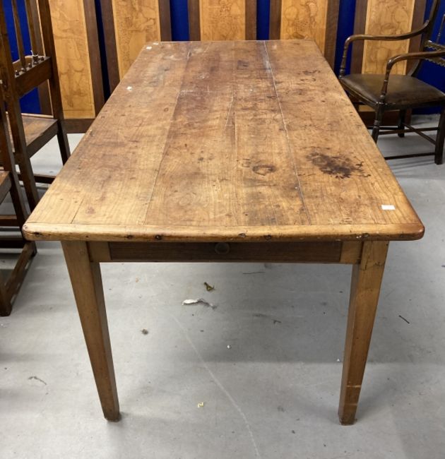 19th cent. French fruitwood farmhouse table, four plank top with cleated ends, single drawer on one end slide to the other, on square tapered legs. 71ins. x 33ins. x 29½ins. Slide extended 17¾ins.