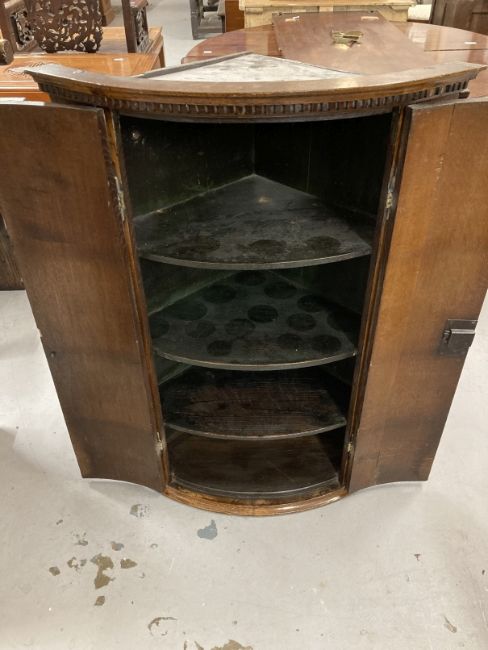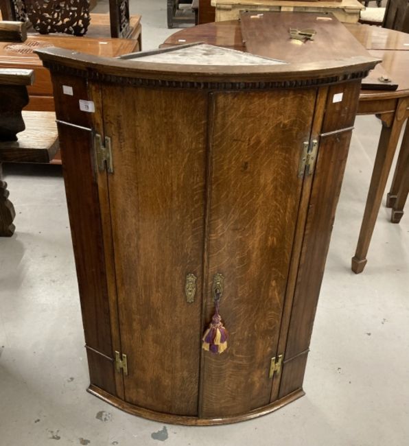 18th cent. Oak bow front hanging corner cupboard dentil cornice above 2 doors on a moulded base, the interior with 3 fixed shelves. 27½ins. x 18½ins. x 39ins.