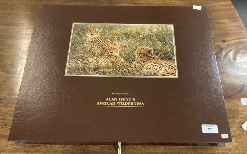 ALAN HUNT (b.1947): The Sappi Portfolio-African Wilderness, set of eleven colour prints of wildlife each accompanied by an essay written by Hunt from his time in Botswana and South Africa collecting material for the paintings, edition no. 201/995, each signed in pencil to the margin in portfolio.