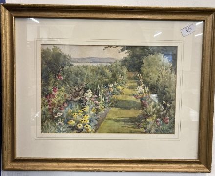 Frieda (Frederica Marie/Mina) Rickenbach MBE (1867- 1951): Exh' Dudley Gallery London 1899 and 1900, Royal Academy 1915. Watercolour. Signed front lower right. Label verso inscribed as Isle of Wight seen from Lymington Hampshire. Summer garden scene. Frieda was painting nearby in Dorset c1914-1915 so this may date similarly. 14½ins. x 9½ins, glazed frame 17¾ins. x 22½ins. Frame has some paint loss on right hand side.