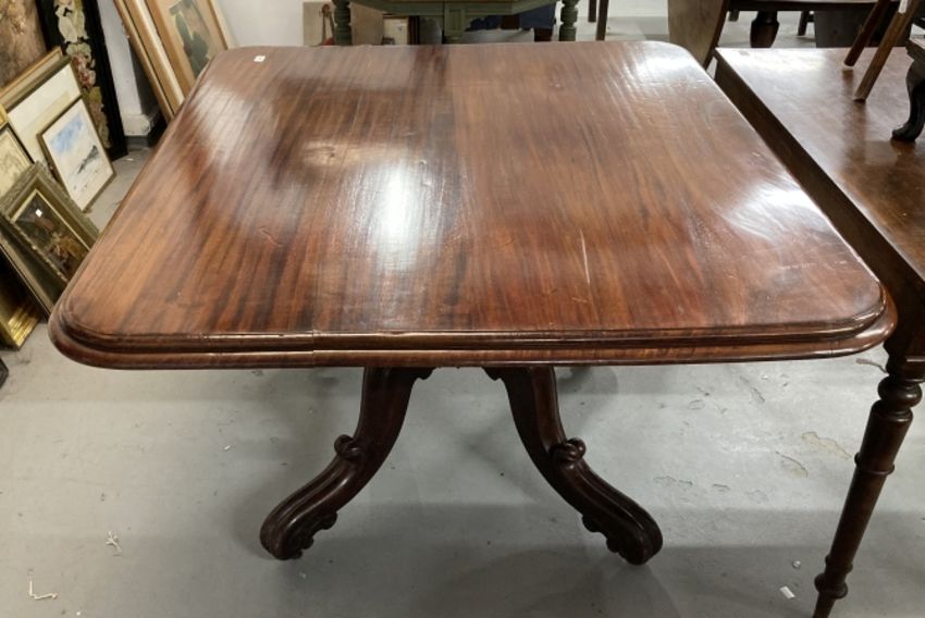 Early 20th cent. Mahogany tilt top dining table on turned central support with tripod feet. Top A/F. 52ins. x 47ins.