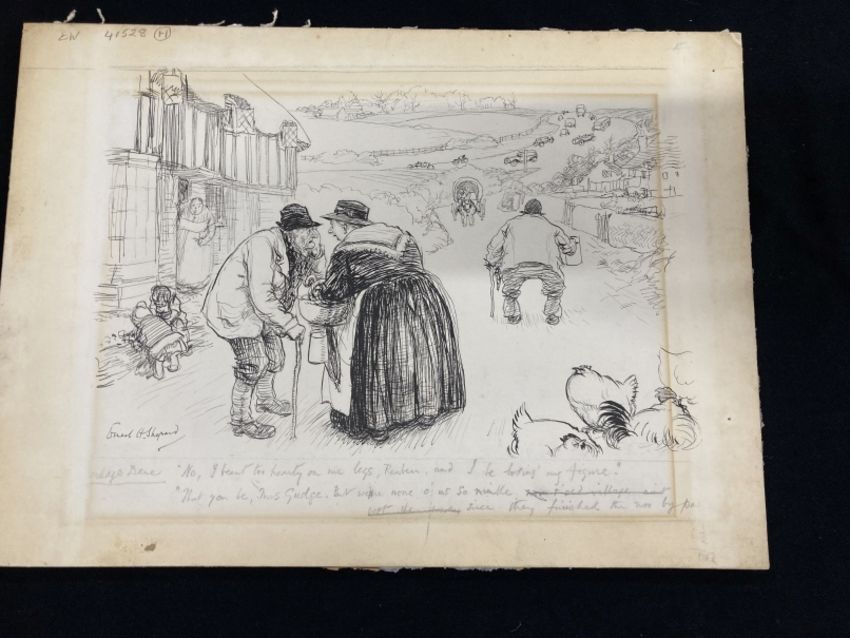 •Ernest Shepard (1879-1976): 'Village Dame' pen and ink believed to be an illustration for Punch magazine, signed bottom left. Pencil notation to bottom margin, 'No I beaut too hearty on my legs Reuben and I be losing my figure.' 'That you be Mrs Gudge but none of us so nimble since they finished the noo by pas.' 14ins. x 11ins.