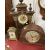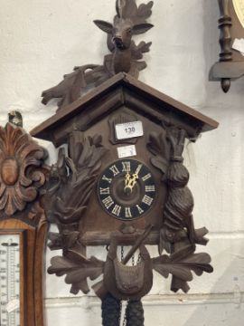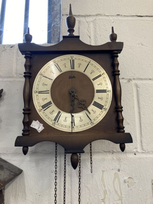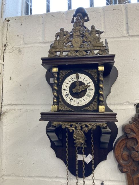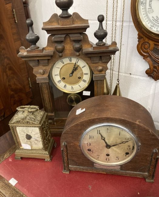 Clocks: Group of three to include 20th cent. German oak cased mantel clock surmounted by turned finials, bronze enamelled face, key wind, plus a 20th cent. British dome shaped oak cased mantel clock presented to an RSM of 4th Battalion Wilts. Regiment 1938 and a 19th century brass mantel clock, unsigned. Plus Clocks: Group of three to include 20th century reproduction Dutch start wall clock surmounted by a figure of Atlas, a Black Forest cuckoo clock A/F, and a mid 20th century German Wubo chain wind wall clock.