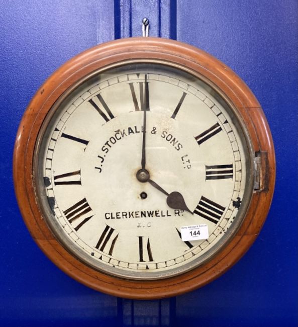 Clocks: 19th cent. Wall clock, cream painted dial J.J. Stockall & Sons Ltd, Clerkenwell Rd, in a mahogany case 15ins.