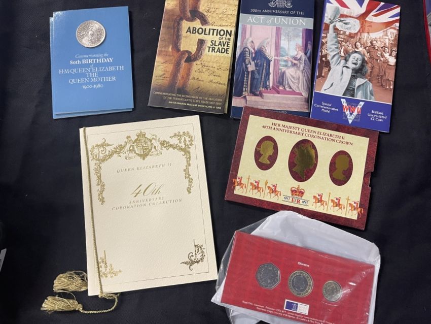 Coins/Numismatics: Collection of Brilliant uncirculated and mixed coins to Abolition of Slavery Two Pounds and 2005 Britain's New Coinage. (8)