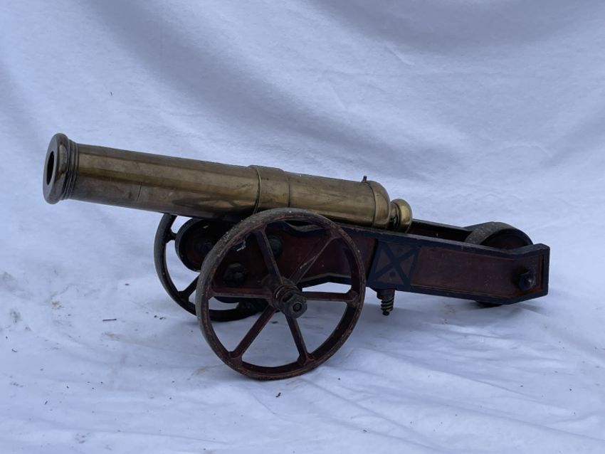 MILITARIA: A mid-19th century brass signal cannon, with cylindrical barrel on a shaped truckle base, inscribed PEACE 1856 TRUST IN PROVIDENCE AND KEEP YOUR POWDER DRY with two large spoked front wheels and central back wheel, with X design, 14½ins. high, 29½ins. wide, 15¼ins. deep.