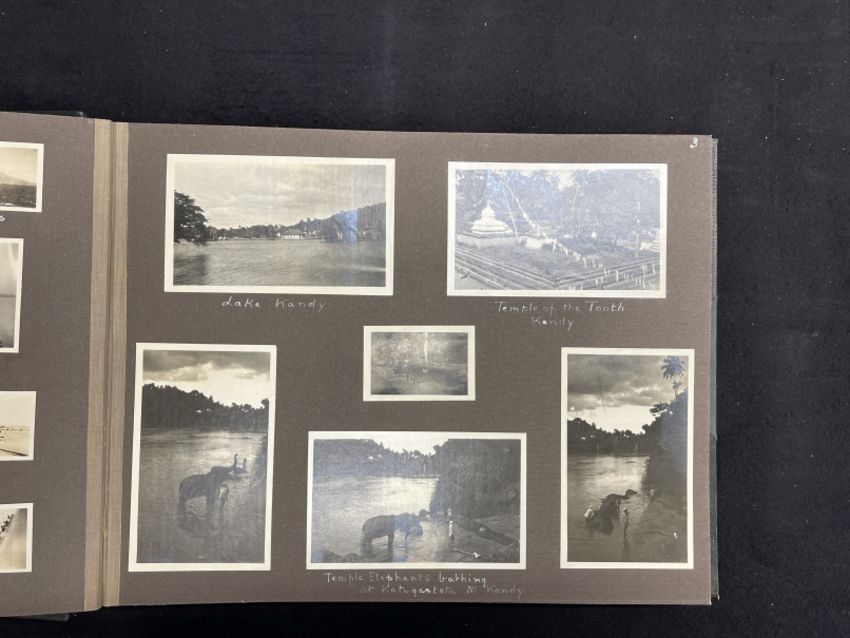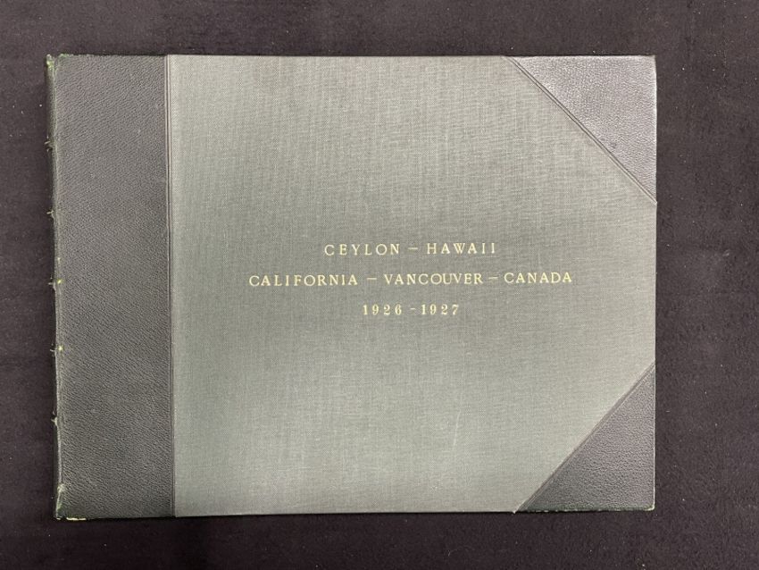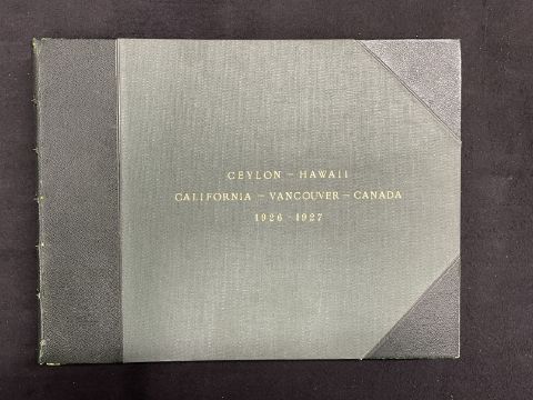 TRAVEL: A superb leather bound album dating from the 1920s of around the world adventure via the Canadian Pacific. Approximately fifty pages of original photographs, postcards and scraps from promotional brochures. The front cover reads 'Ceylon, Hawaii, California, Vancouver, Canada. 1926-27'. 16ins. x 12ins.