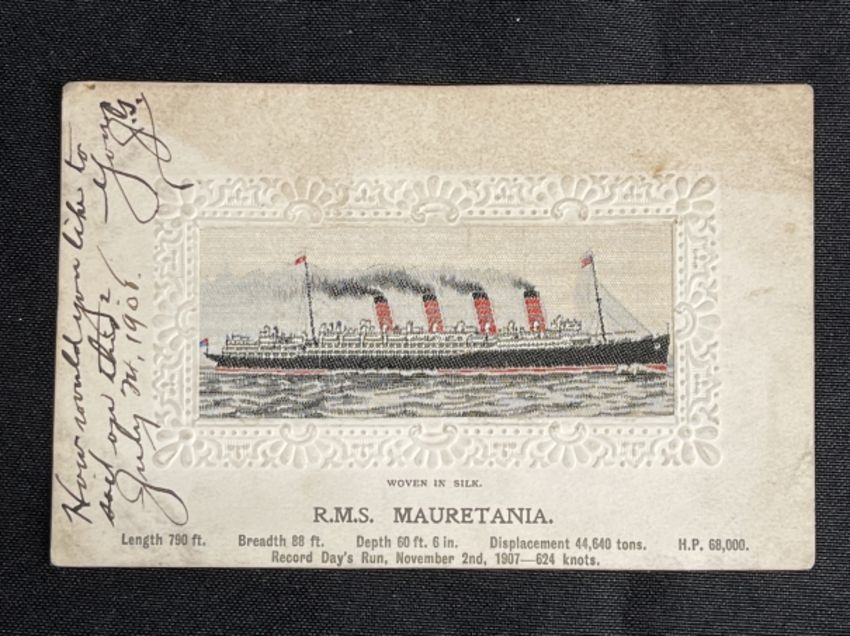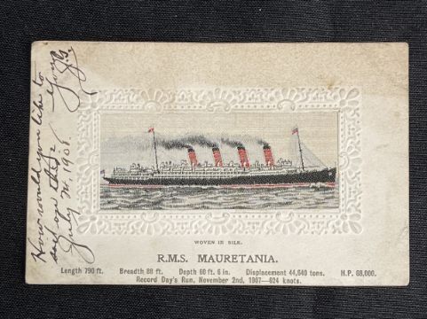 R.M.S. MAURETANIA: Unusual on board silk postcard, postally used Queenstown 1908.