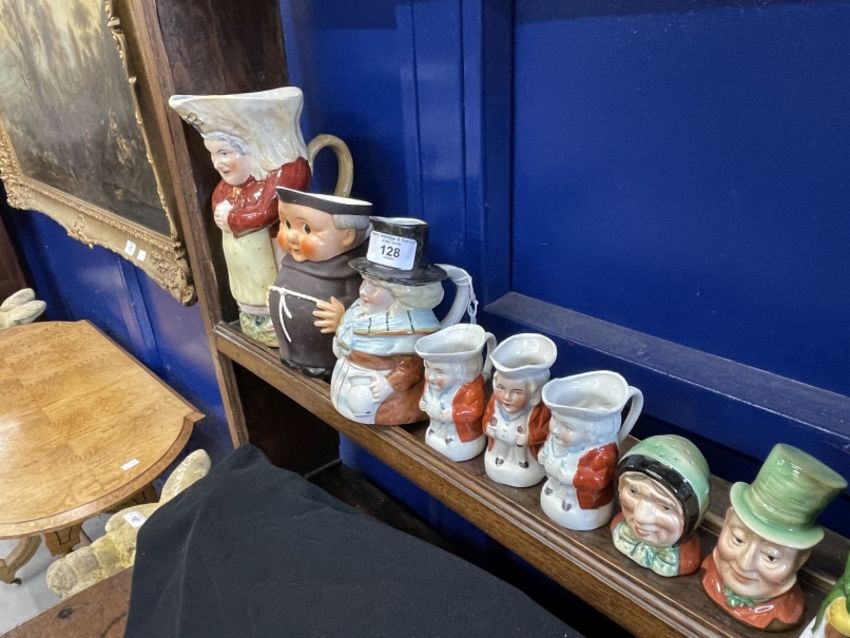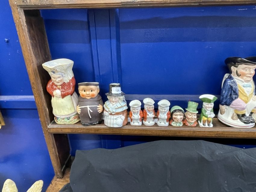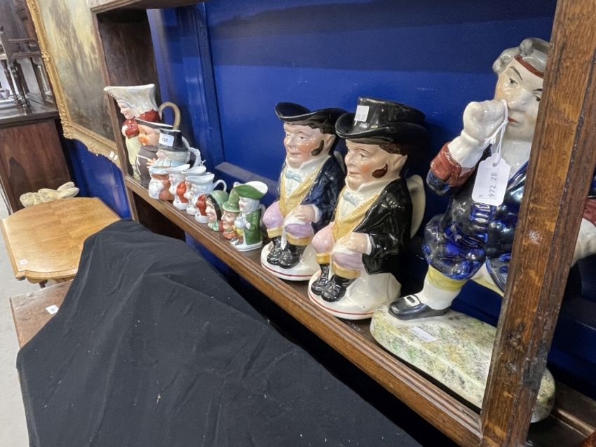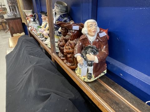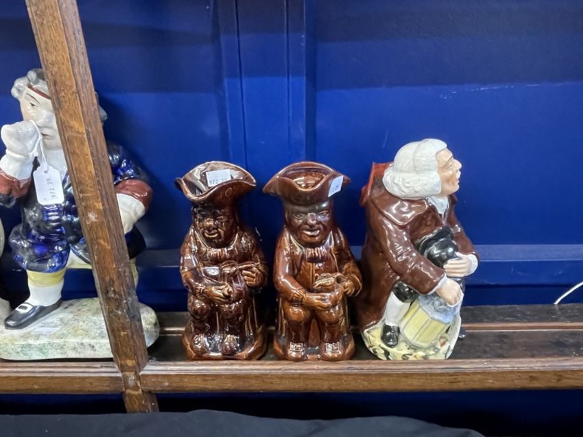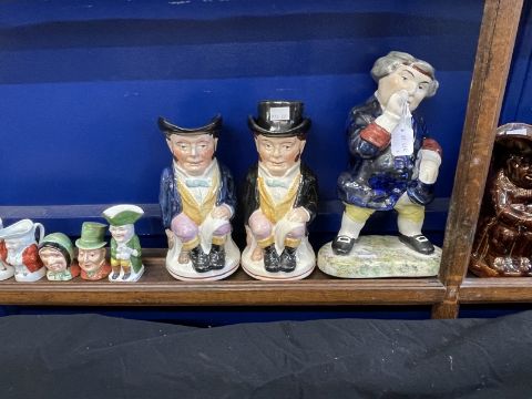 19th/20th cent. Ceramics: The Blake Collection: Toby Jugs Polychrome seated lamp lighter in shades of brown and black with painted base, two seated Rockingham treacle brown, one with cap, 8ins. Beswick condiment, Dickens vase, Mr Micawber salt, Sairey Gamp pepper, c1950, Goebel jug in the form of a monk, Martha Gunn, Welsh woman, and four Continental miniature Tobys. Toby Jugs Polychrome seated, one hand on lap the other by his side with cap, another without cap, 9½ins and 10ins; standing Toby snuff taker without cap, on sponge work base, 12½ins.