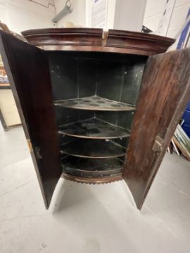Late 18th cent. Mahogany bow front corner cupboard, moulded cornice above two doors flanked by fluted uprights, the interior with three shelves above two small drawers all on a shaped plinth. A/F 42½ins. x 32ins.