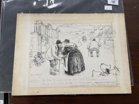 •Ernest Shepard (1879-1976): 'Village Dame' pen and ink believed to be an illustration for Punch magazine, signed bottom left. Pencil notation to bottom margin, 'No I beaut too hearty on my legs Reuben and I be losing my figure.' 'That you be Mrs Gudge but none of us so nimble since they finished the noo by pas.' 14ins. x 11ins.