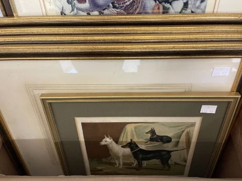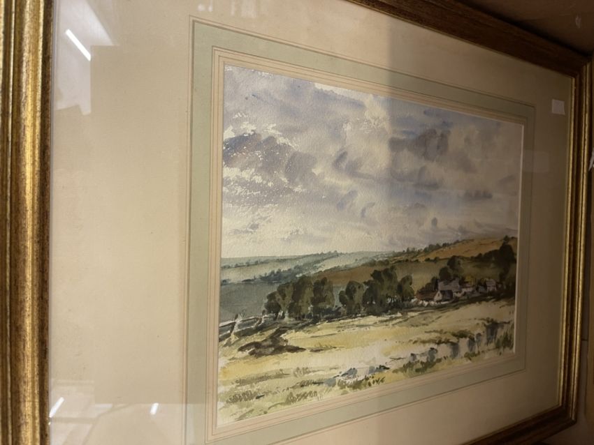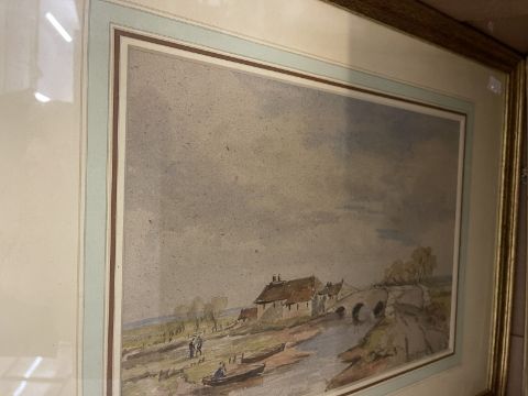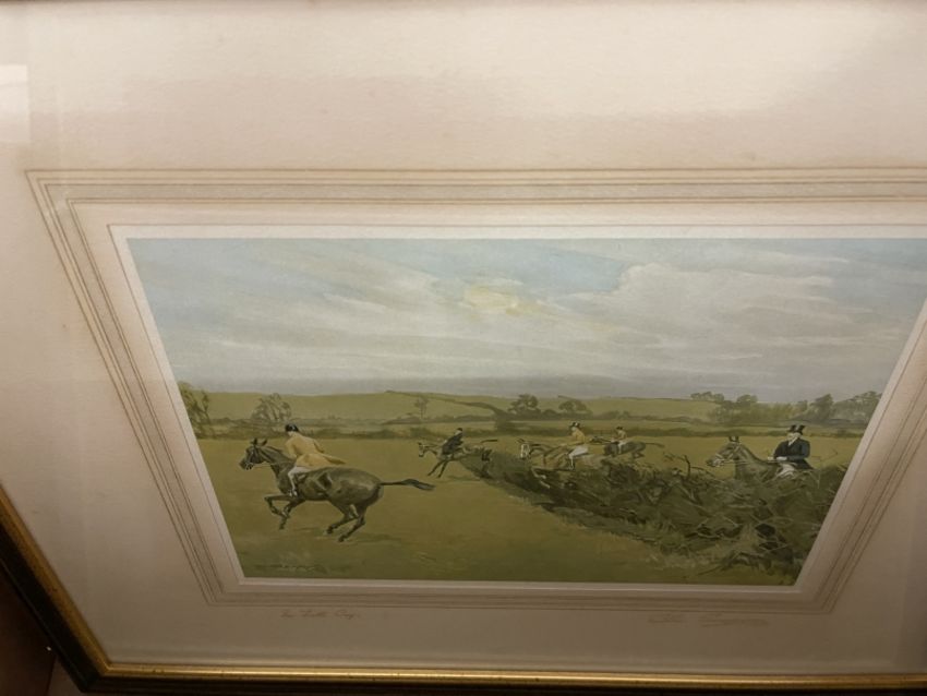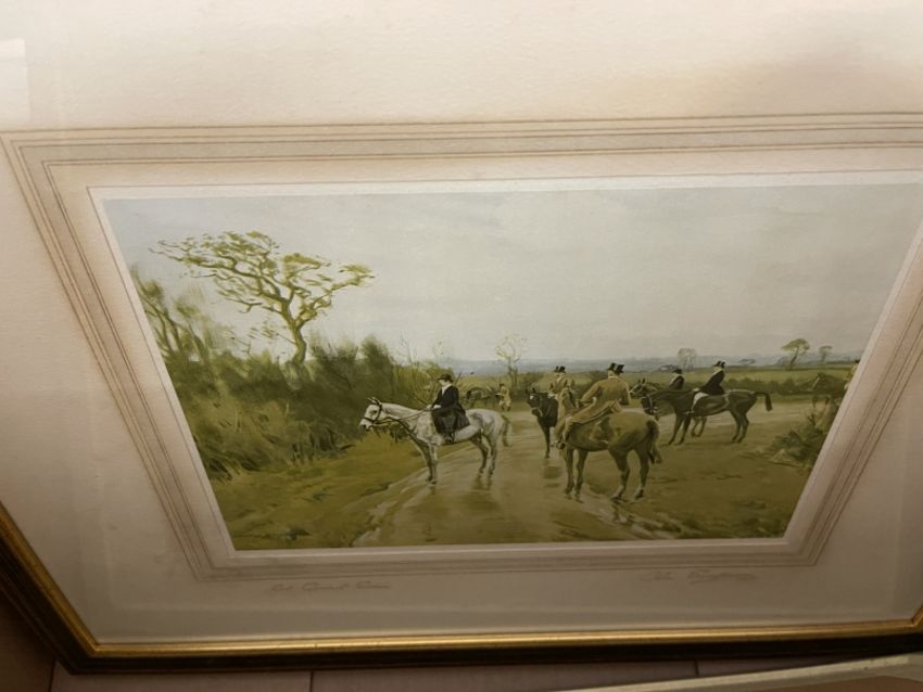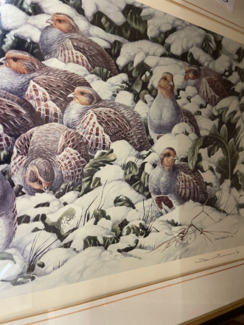 P.C. Clemmow two watercolours titled An Old Bridge, signed, framed and glazed 9¾ins. x 14ins. and Landscape with Farm, signed, framed and glazed 9¾ins. x 13ins. Limited edition Winter Partridges by David Binns, signed 91, four hunting prints and a print of English terriers. (8)