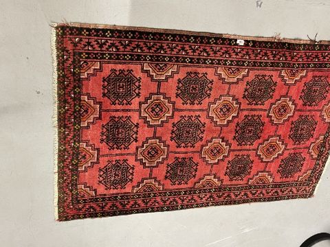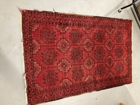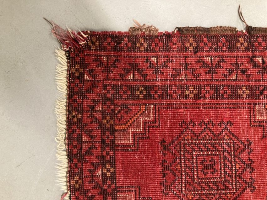 Carpets & Rugs: 20th cent. Turkman rug, red ground, three borders, eighteen full guls, all in reds, blacks, ivories and oranges. 70ins. x 44ins.