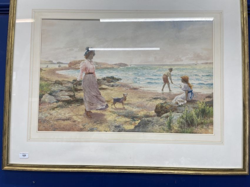 Alfred Glendening Jr. (1861-1907): Watercolour A Summer Holiday, woman, children and dog on the beach. Signed monogram lower left, dated 1888. 20ins. x 30ins. Gilt and glazed frame 30ins. x 40ins.