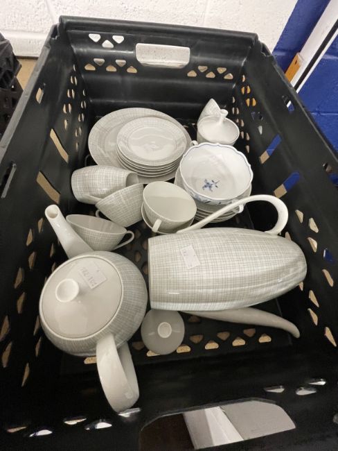 Mid 20th cent. Design German Arzburg tea and coffee ware, pale blue pattern comprising coffee and teapots, cream jug, sugar bowl, cup, saucer and plate x 5, and cake plate. Plus 20th cent. Meissen onion flower two handled bowl.