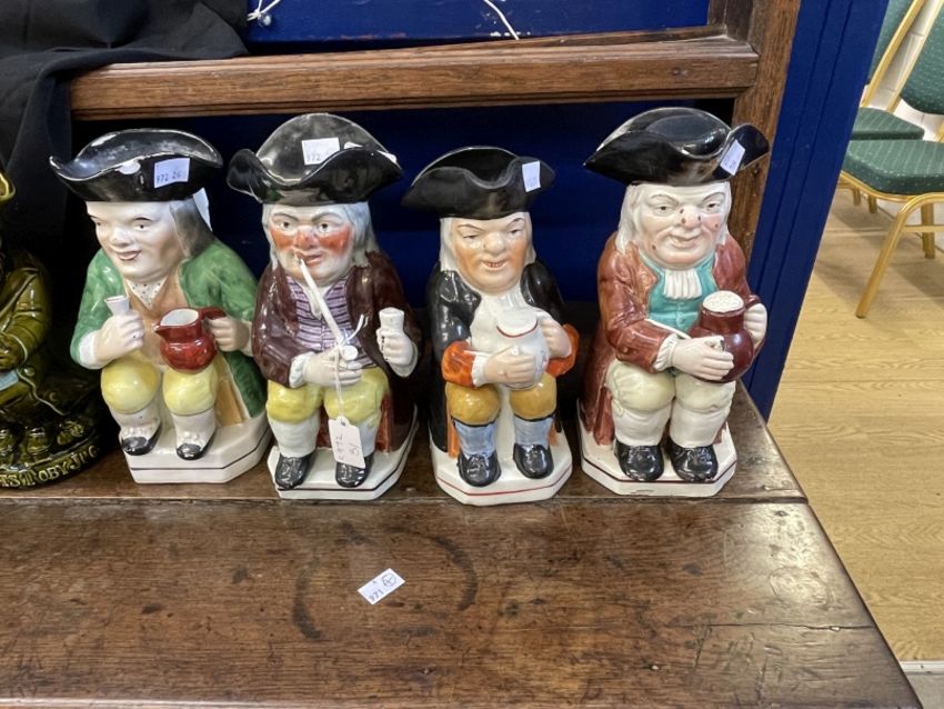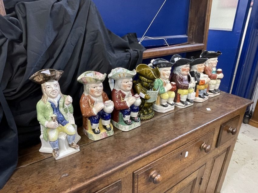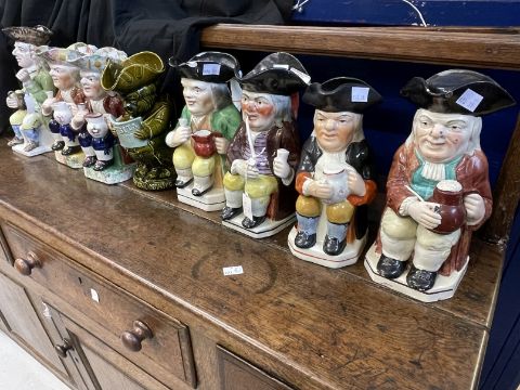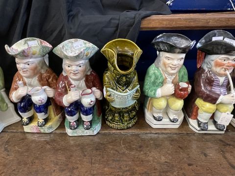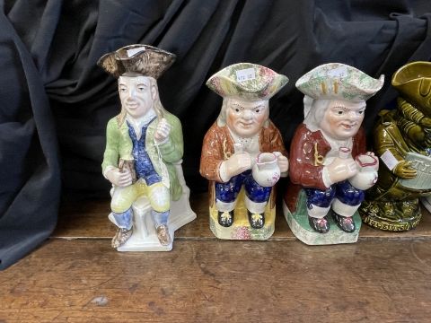19th/20th cent. Ceramics: The Blake Collection: Toby Jugs polychrome smoking a pipe A/F, another with a jug of ale holding a pipe A/F, and one other. Toby Jugs polychrome seated holding a cup and jug, sponge decorated cap and base, a pair, 10ins. Polychrome seated gentleman holding tankard, 11ins. The Blake Collection: Toby Jugs Ault pottery 'Tit Bits' Toby jug, green with pale blue glaze newspaper. Plus another example A/F.