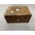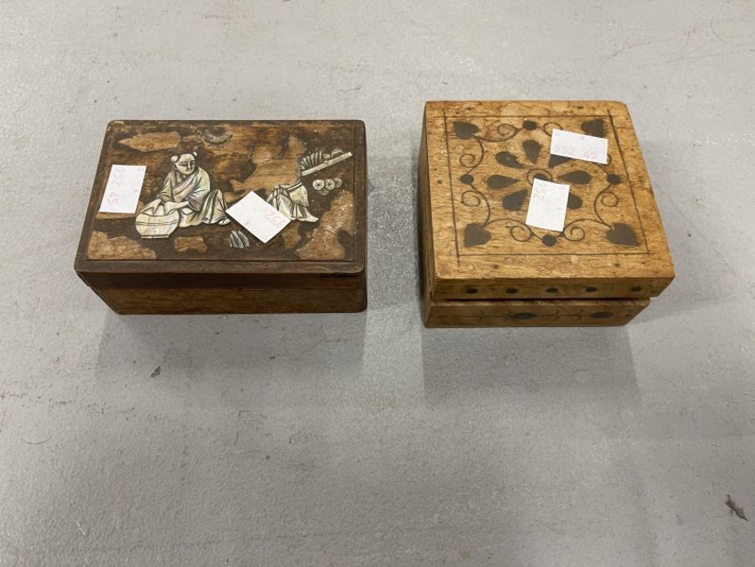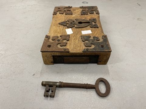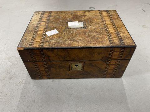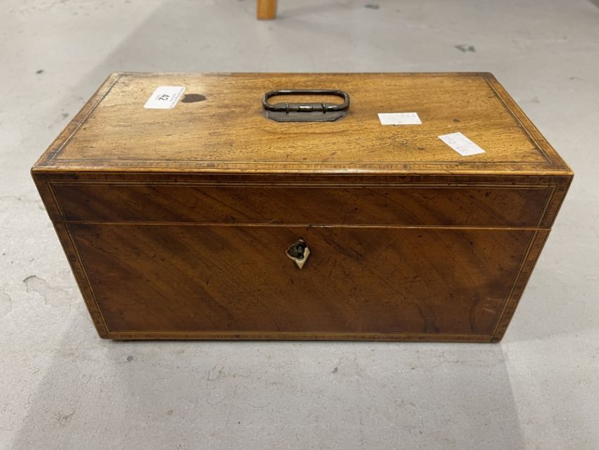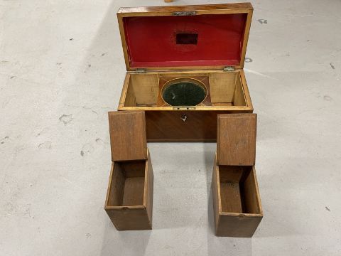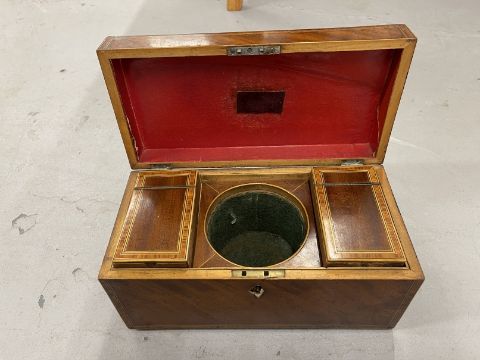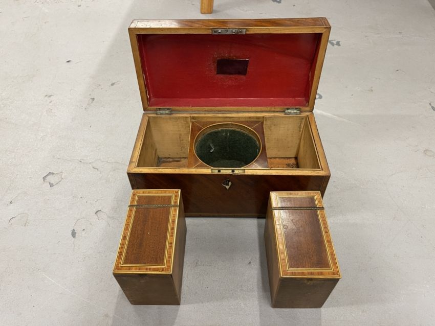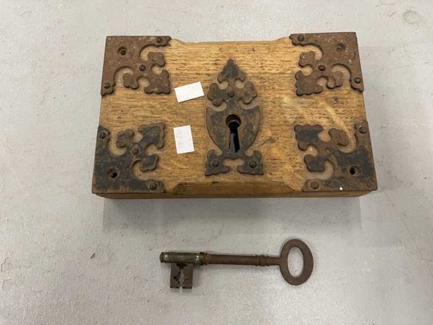19th cent. Mahogany inlaid tea caddy, walnut jewellery box and two small trinket boxes. 19th cent. Gothic door lock with key