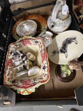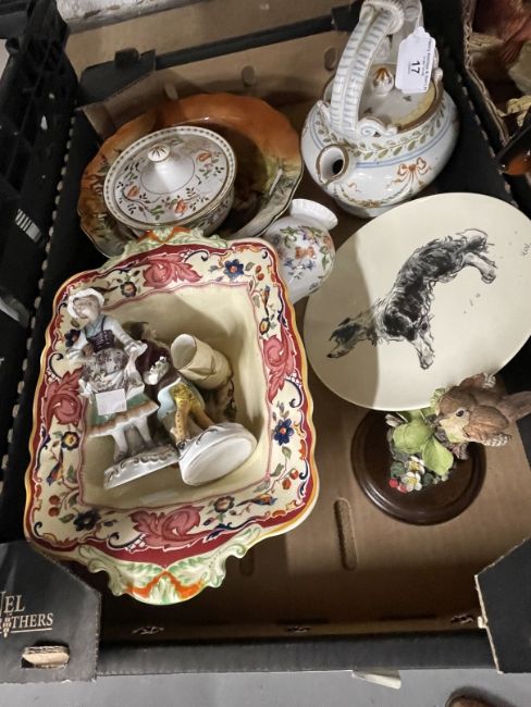 Ceramics: Doulton Old English bowl, venison bowl, Country Artist wren, 19th cent. Coalport powder bowl, Aynsley vase, Esme Samson figures Dandy and his Lady (Dandy A/F), Royal Worcester bamboo miniature vase, Cantagalli teapot decorated with floral swags.