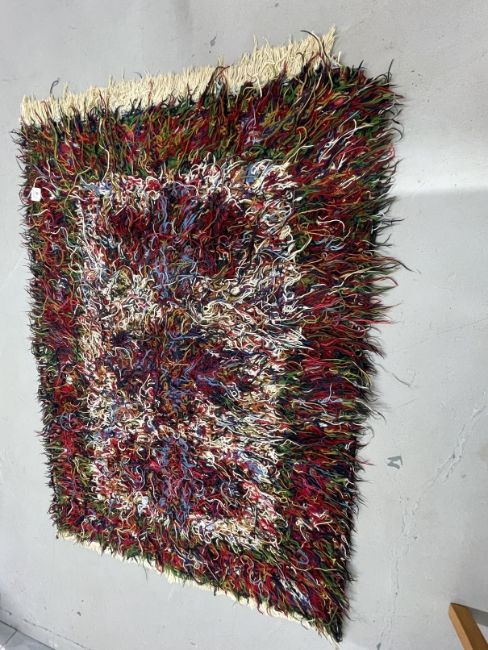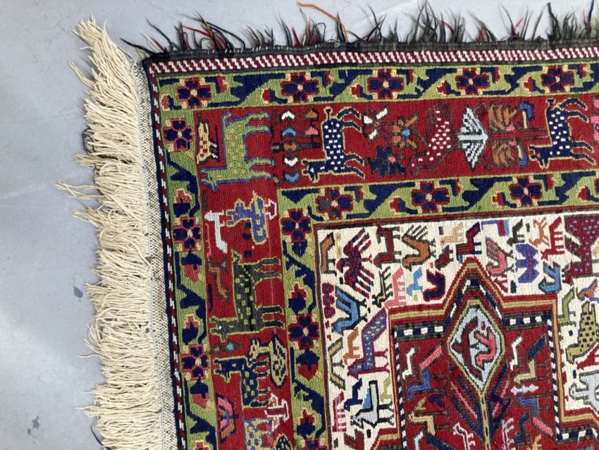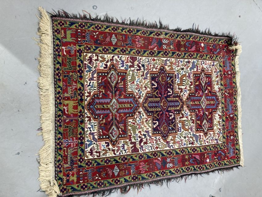 Carpets & Rugs: 20th cent. Southern Asian rug, ivory ground, three borders and three central panels all featuring animals, birds and flowers in reds, greens, blues, blacks, oranges, ivories and browns. Untrimmed on reverse. 60ins. x 43ins.