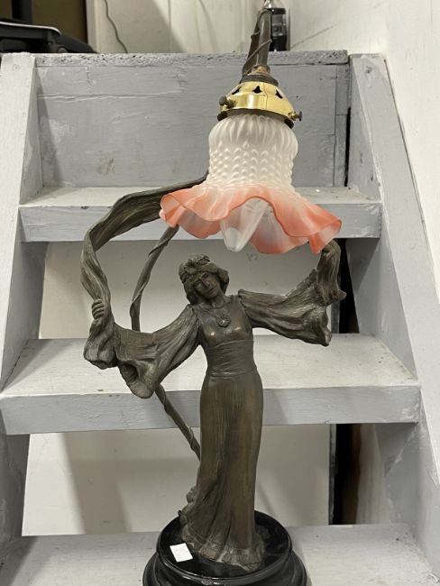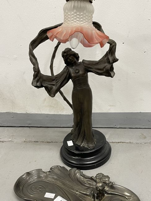The Mavis and John Wareham Collection: 20th cent. Decorative Art Nouveau style white metal tray plus female resin table lamp with glass shade.