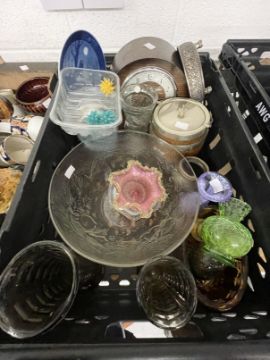 The Mavis and John Wareham Collection: 20th cent. Oak mantel clock, oak biscuit barrel, City of London 1923 engraving, glass bowls, Venetian pink glass bowl, Festival of Britain vase and other miscellaneous ceramics.