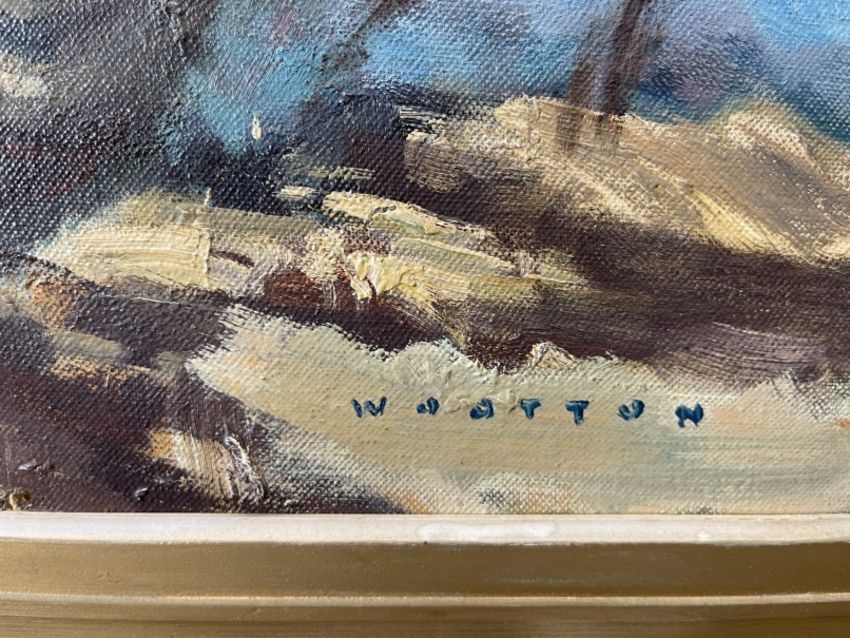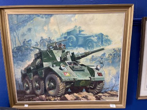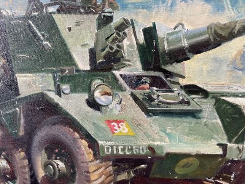 •Frank Wootton (1911-1998): Oil on canvas, Saladin armoured car commissioned by Major Dennis Sullivan, former Middle East Sales Manager for Aivis in the 1960s. 21ins. x 25ins.