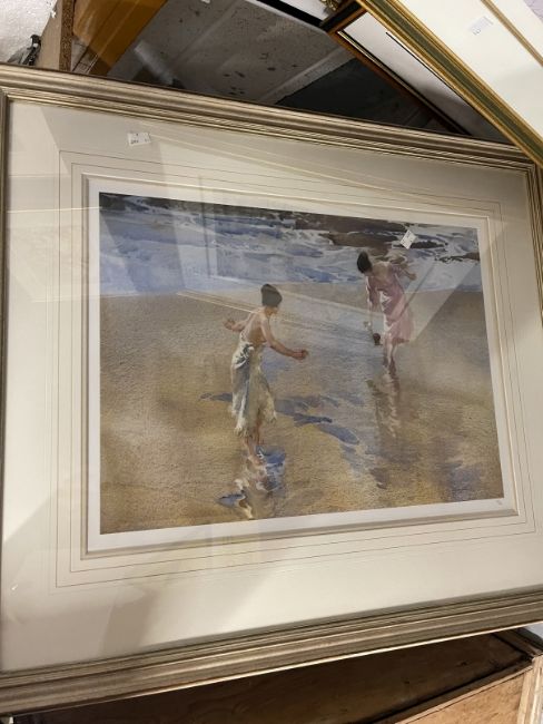 Limited Edition Prints: 20th cent. Sir William Russell Flint (1880-1969) 136/675 WRF blind stamp, reading on a terrace, framed and glazed. 21ins. x 16½ins. 406/750. Blind WRF Stamp, framed and glazed. 17ins. x 16ins. 138/85, Michael Stewart Fine Art blind stamp , lady in a blue dress, framed and glazed. 24ins. x 16ins. 211/650, WRF blind stamp, ladies on beach, framed and glazed. 24ins. x 28ins. (4)