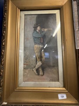 19th cent. Italian School: Watercolour, figure playing wind instrument, signed lower right L. Pasini, framed and glazed. 10ins. x 14ins.