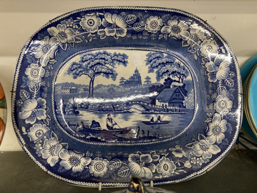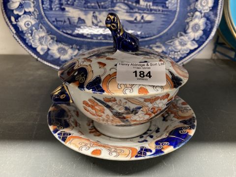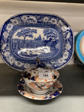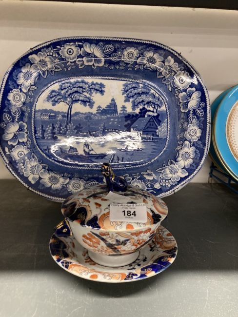 19th cent. English Ceramics: Masons Imari bowl, stand and cover, Spode blue and white meat serving plate 'View of Nuneham Courtenay'.