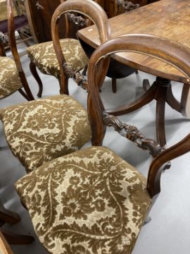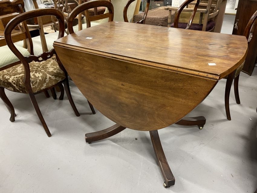 Early 19th cent. Mahogany oval dining table with two flaps on a baluster shaped column and four splay reeded legs 53ins. open x 37½ins. x 28½ins. Closed 23ins. Plus Victorian set of five mahogany hoop back dining chairs with cabriole legs upholstered seats.