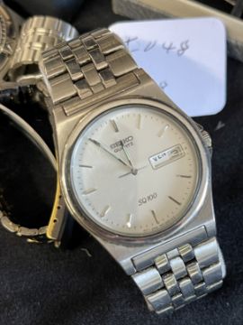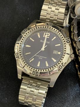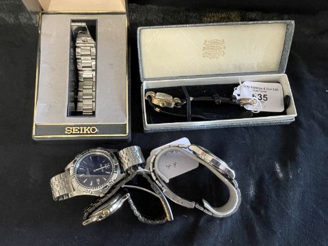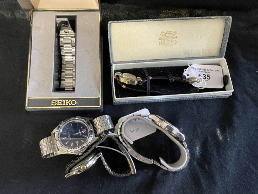 Watches: Gentlemen's watches, all stainless steel, Seiko, Limit and Accurist. Plus a stainless steel bracelet. plus Ladies 9ct gold Tudor, rectangular dial, Arabic numerals and baton on a black cord strap.