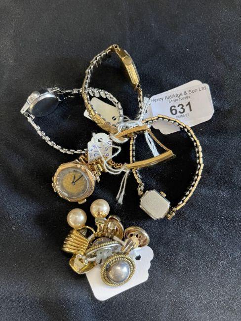 Watches: Ladies 18ct gold case on metal bracelet, a 9ct gold case on a metal bracelet, a gold plated and a stainless steel example, three pairs of gold plated earrings and a silver pair of earrings all with clip on fittings.